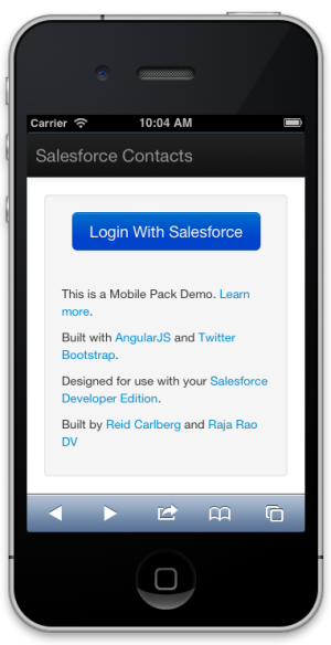 AngularJS MobilePack comes with all the necessary code for you to build Salesforce mobile apps using popular Google's AngularJS JavaScript framework and UI frameworks like: Twitter's Bootstrap and JQuery Mobile. It also comes with sample apps that shows how to run such apps on various environments like Salesforce Visualforce, Heroku etc.