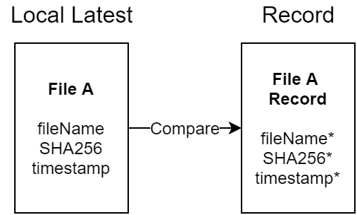 The program encapsulate the File class and create a new class named CustomFile. It is used to store some key information of the file such as the SHA256, timestamp, path, etc. The SHA256 is a sequence of encryption based on the data of the file. The equals method is also override so it will compare the filename, SHA256, and the timestamp, which guarantees that the consistency between local files and the record stored in the program.
