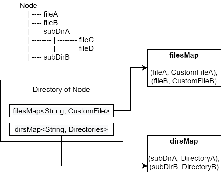 Directory is a data structure to track and store the information of local files and directories. It has two main fields. One is a hash map whose key is the file name and the value is the Custom File type. It is used to save the file under the current directory. Another field is also a hash map whose key is the name of the sub directories under the current directory and the value is the Directory type. Hence, this data structure can easily track all information of local files.