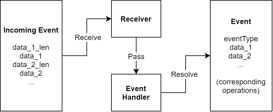 Event handler is another core component of this program. It will be created in Node entity and be passed into sender. When a node receives event data from other nodes, the event handler will resolve the data and determine what kind of event arrives. Then it will do different kinds of operations based on the type of the event.