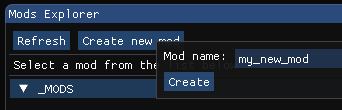 and you will see 2 windows, "Game Directory Explorer" and "Mods Explorer". - Click on "Create new mod" in "Mods Explorer" window