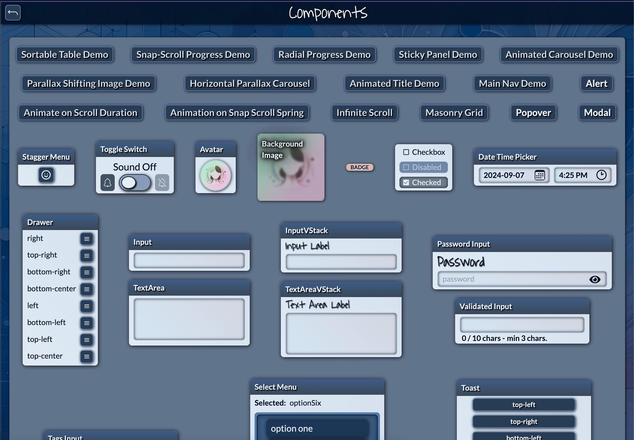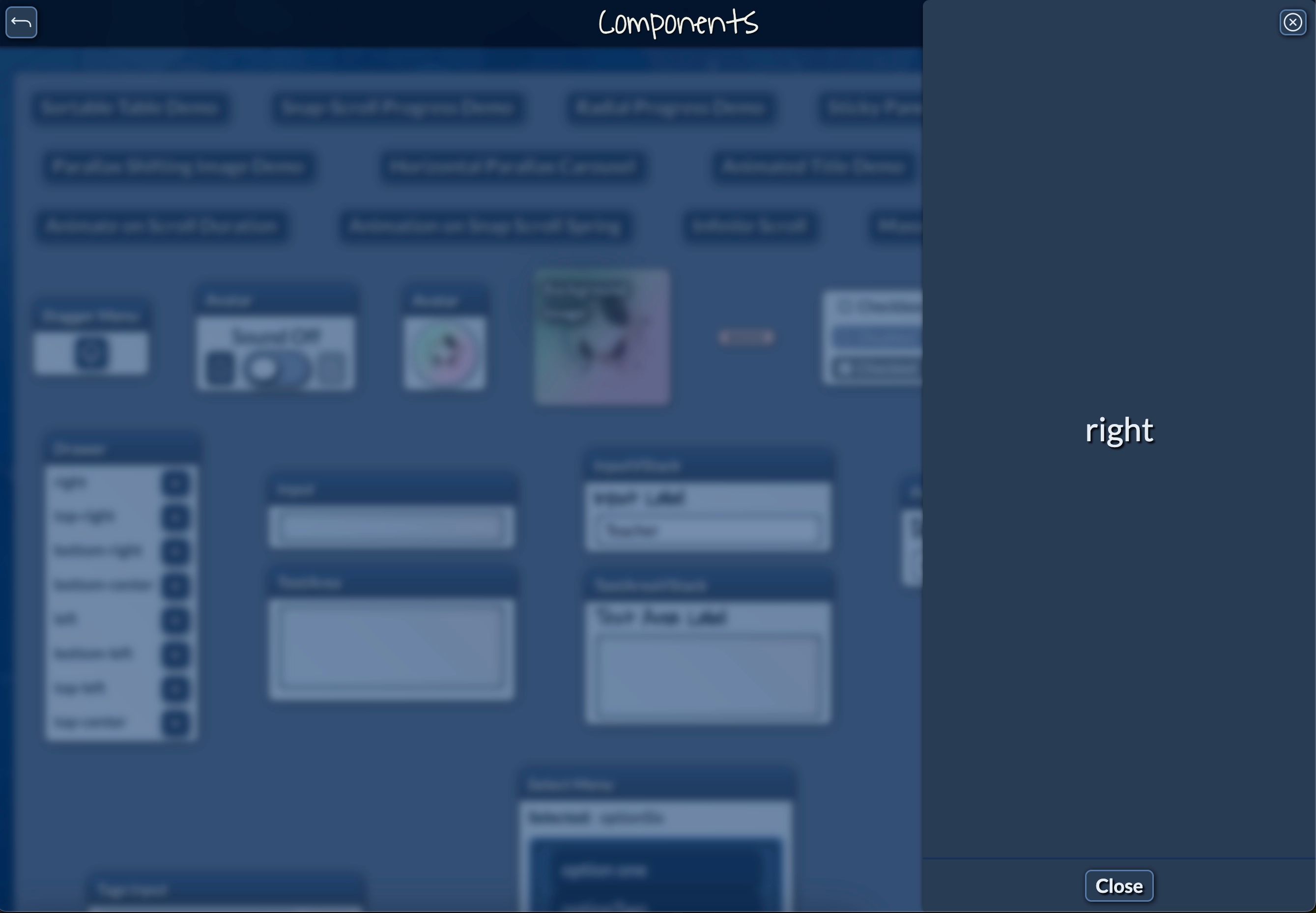 Figure 19: π Drawer - This image demonstrates the drawer component, showcasing a smooth and customizable animation for opening and closing sliding sidebars or panels in a web app layout.