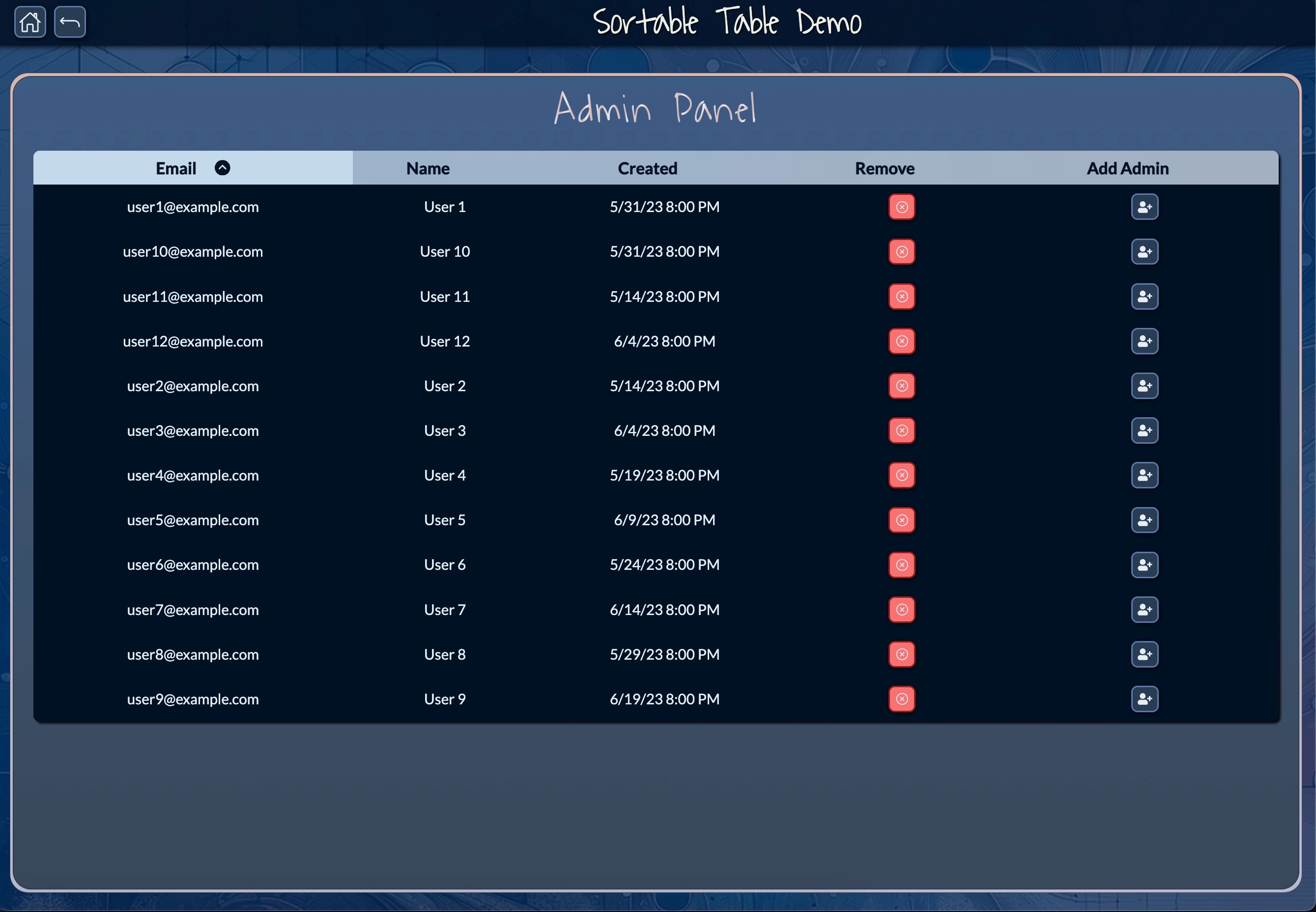 Figure 8: π Sortable Table Demo - This image showcases the sortable table feature in the Remix-Vite-Tailwind template, designed for use in administrative dashboards.
