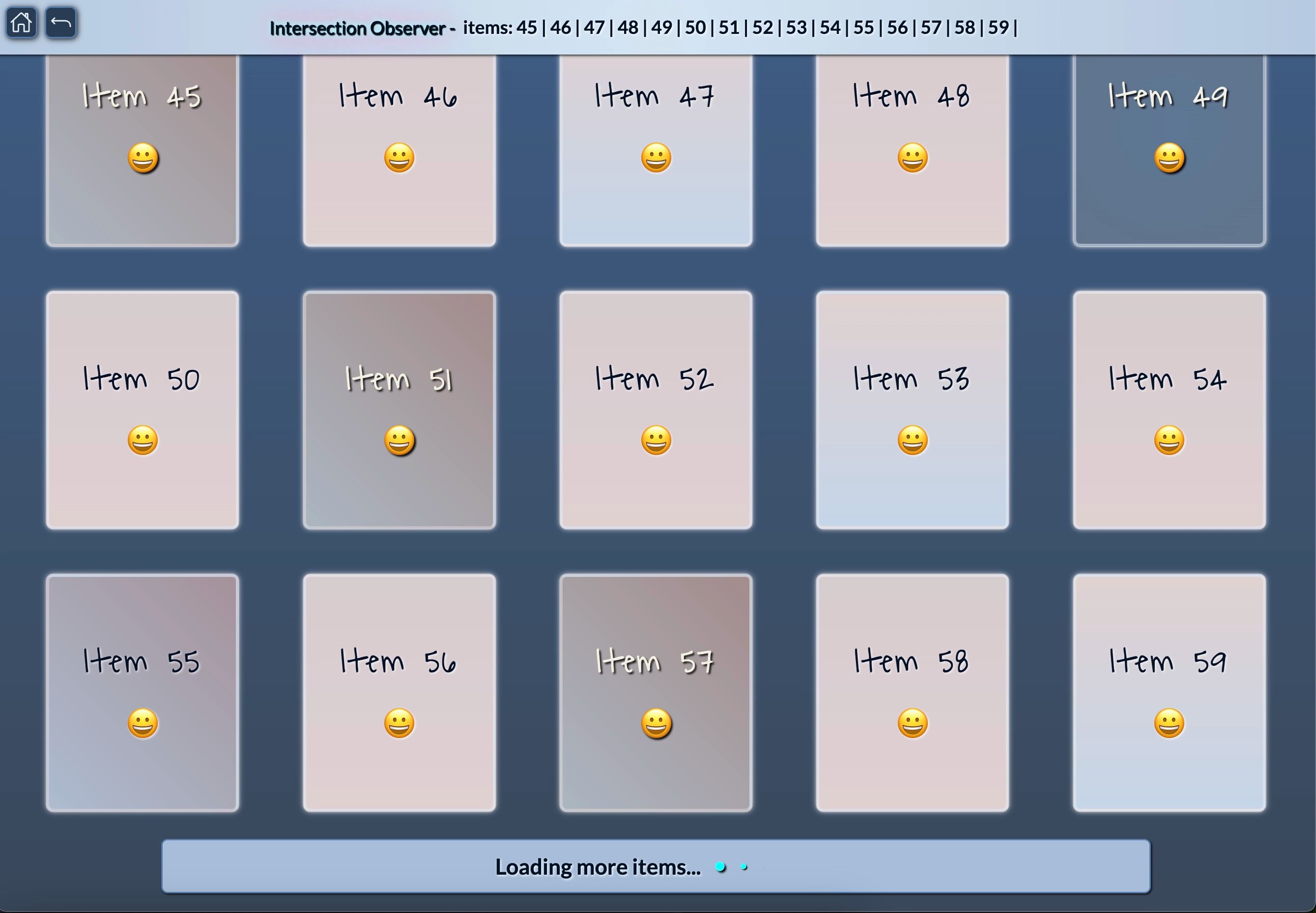 Figure 17: π Intersection Observer - This image demonstrates the Intersection Observer feature, showcasing how items are dynamically loaded as users scroll using the Intersection Observer feature, optimizing performance with lazy loading.