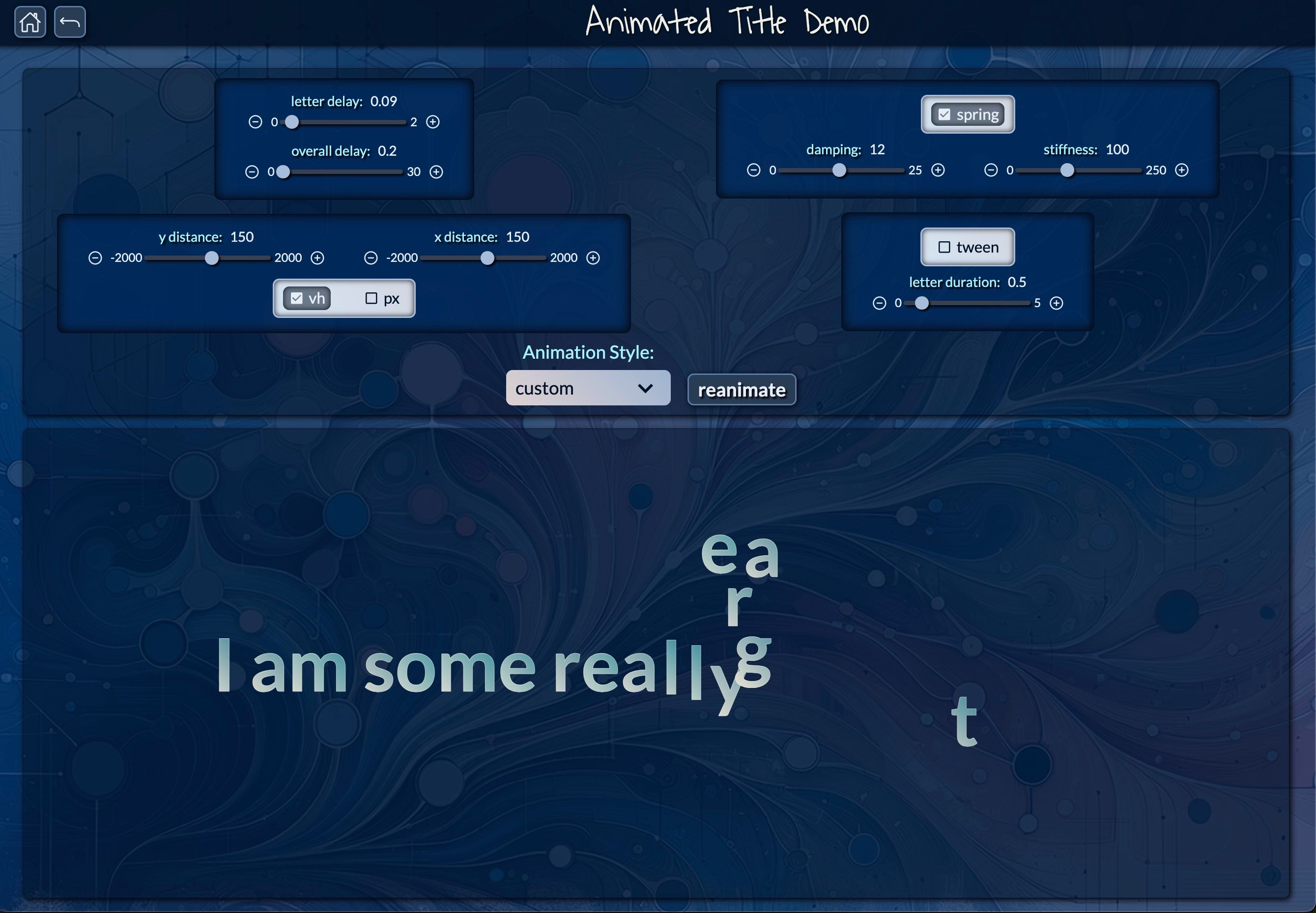 Figure 14: π Animated Title Demo - This image showcases the Animated Title Demo, where developers can configure custom text animations using adjustable parameters like letter delay, distance, and spring stiffness.