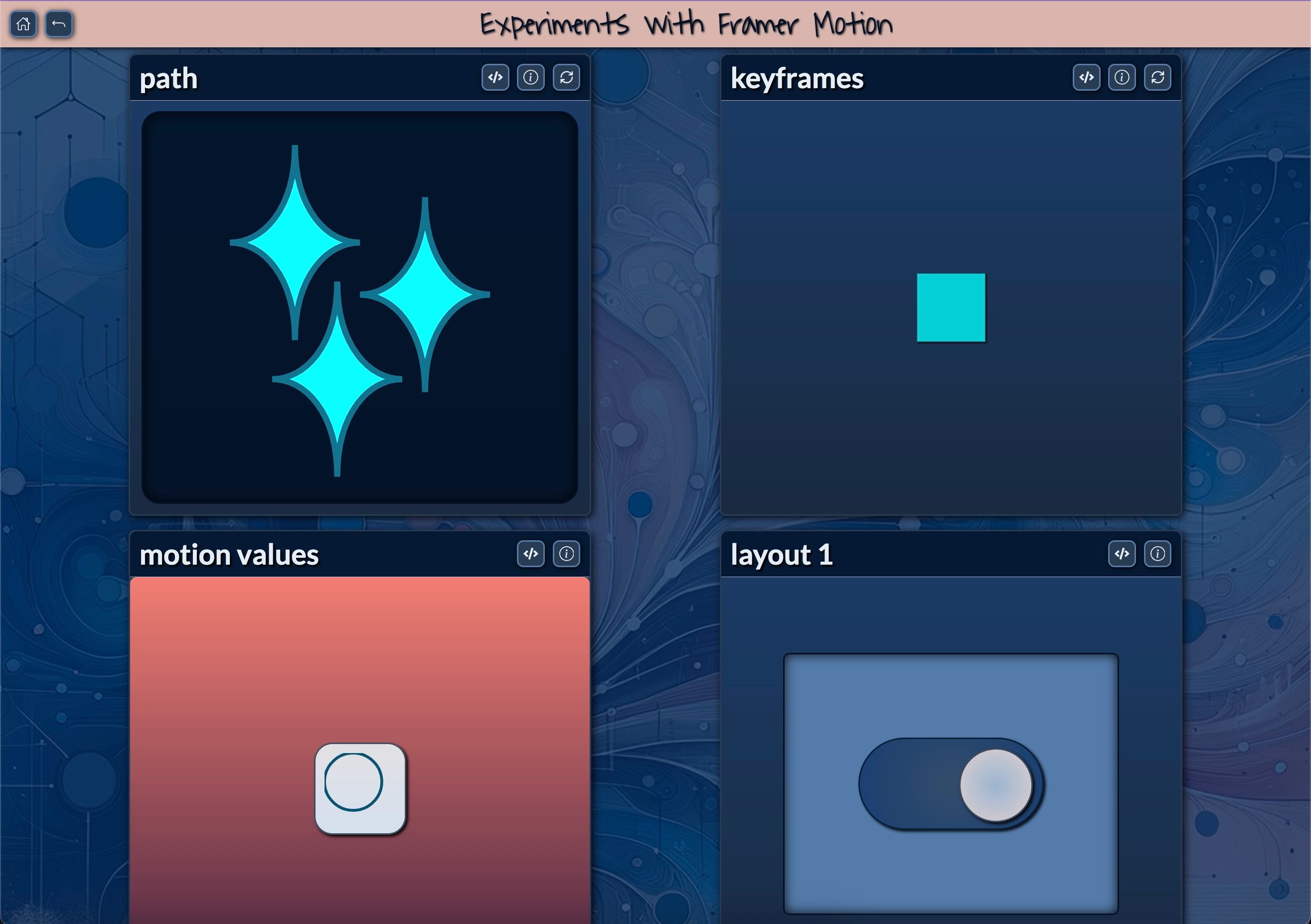 Figure 21: π Interactive Framer Motion - This interactive dashboard showcases a variety of animations created with Framer Motion. It allows users to explore features like keyframe animations, motion values, and layout transitions, equipped with replay controls for seamless experimentation and learning.
