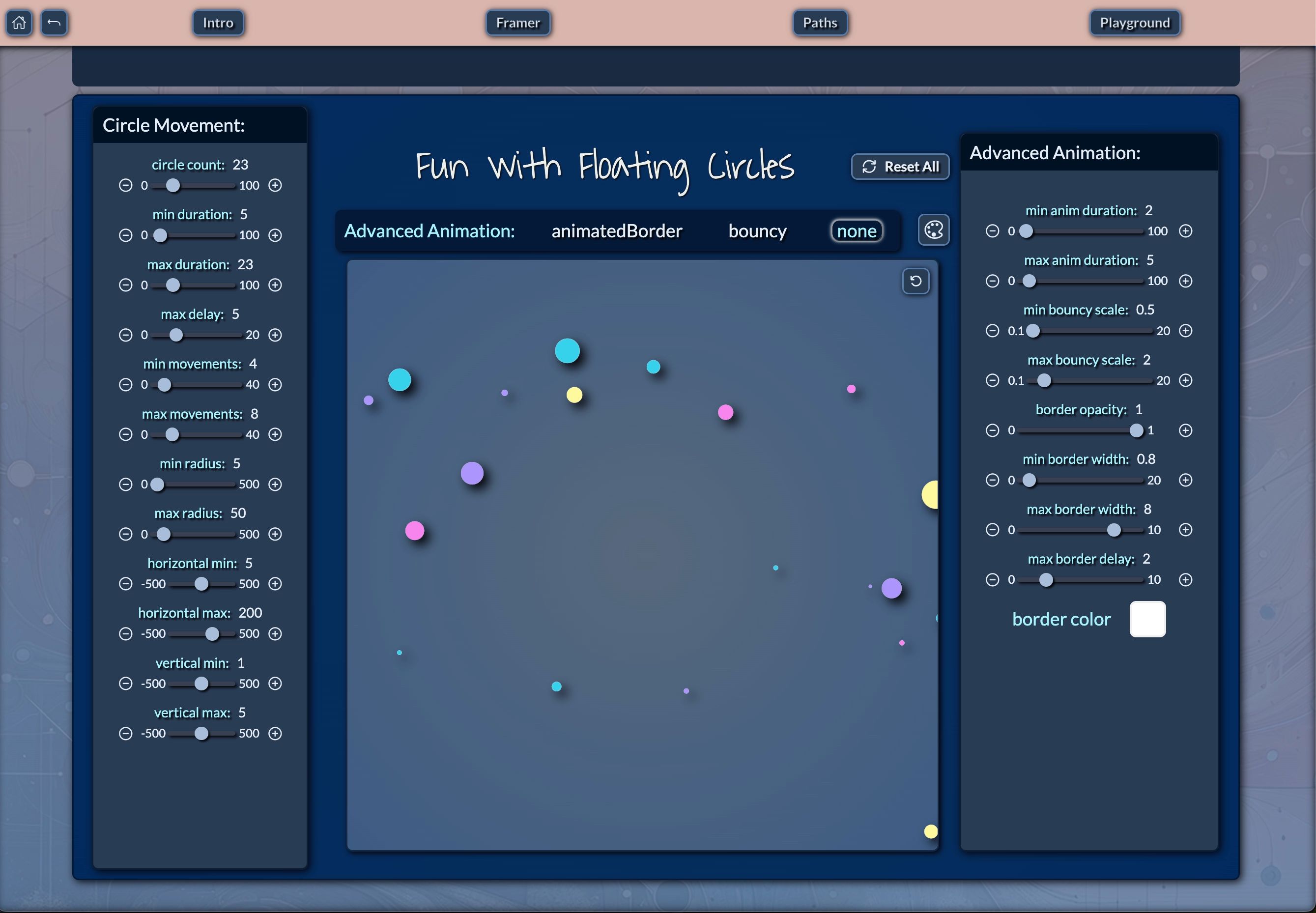Figure 28: π Fun with Floating Circles - This image showcases an interactive Floating Circles Animation Tool, where users can customize various circle movement and animation properties. The interface allows control over the number of circles, duration of animations, size (radius), and movement range (horizontal and vertical). The right panel offers advanced settings like bouncy effects, border animation, and opacity control for even more refined animations. This tool is perfect for visualizing dynamic floating objects, creating engaging animations, and experimenting with circle physics and design elements.