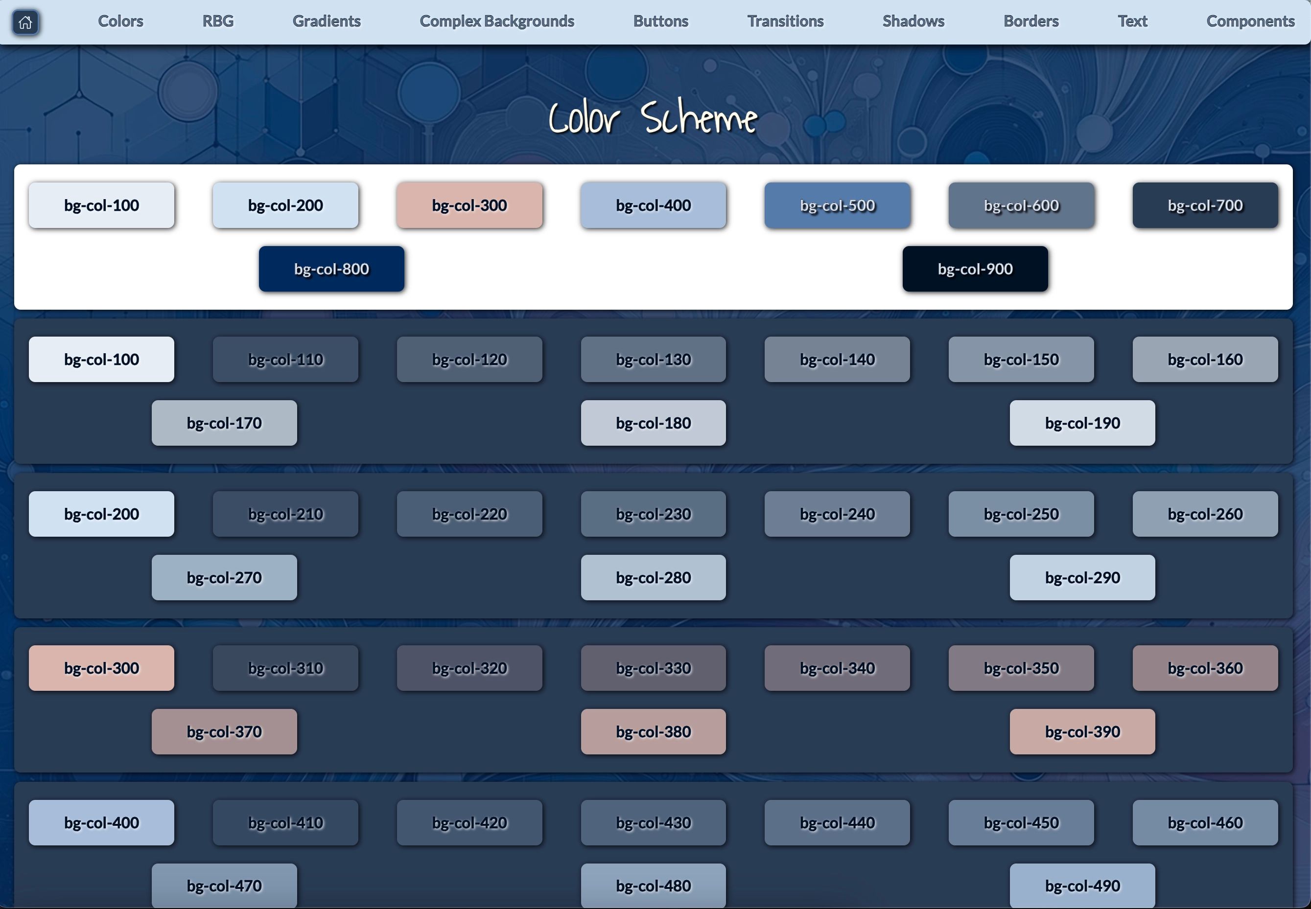 Figure 2: π Color Palette Designer's View - This image presents the dynamic color palette integrated within the Remix-Vite-Tailwind template. Featuring an extensive range of background colors, the palette is fully customizable via the Tailwind configuration file.