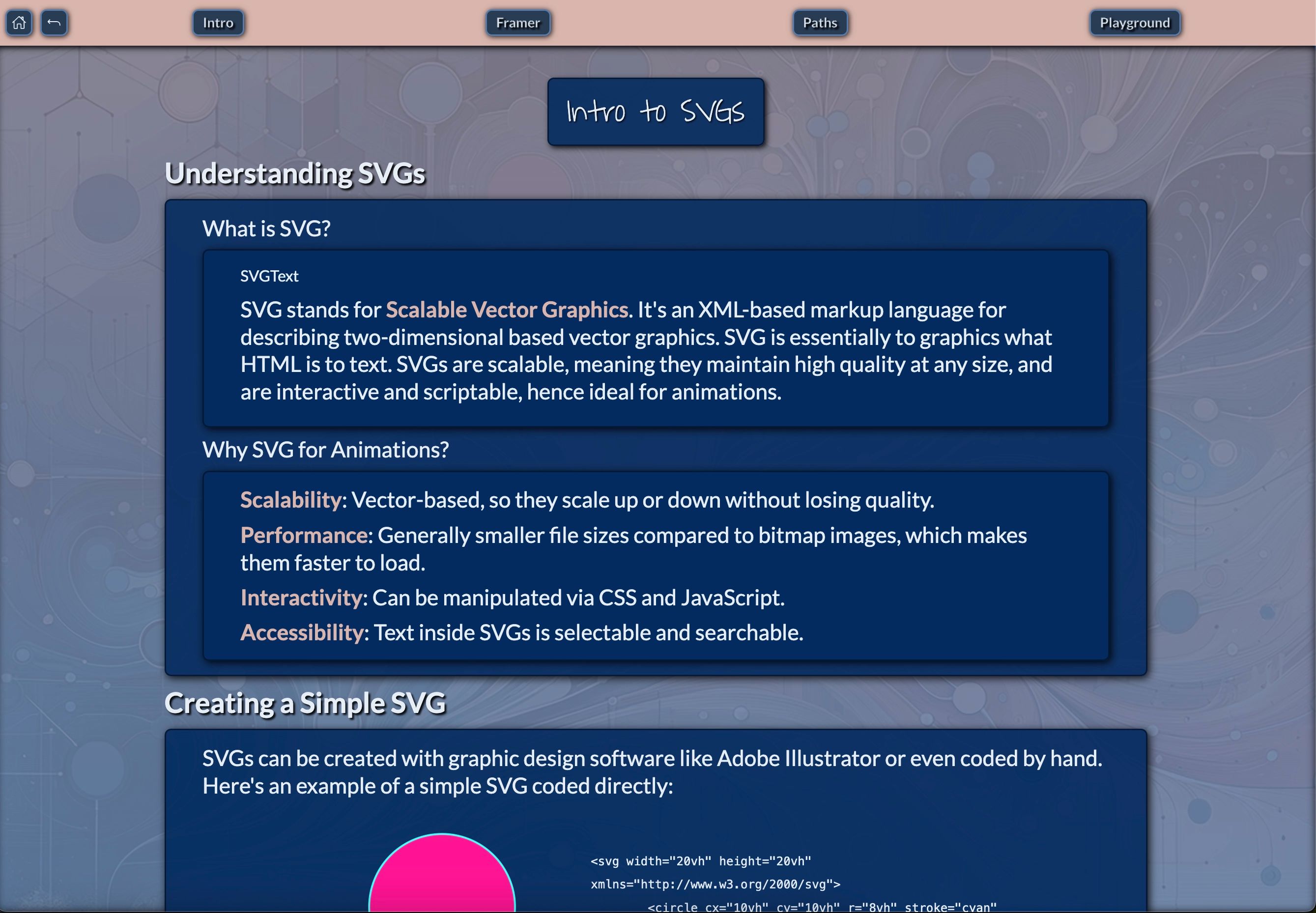 Figure 24: π Intro to SVGs - This image provides an introduction to SVGs (Scalable Vector Graphics), explaining their XML-based structure and benefits for web animations.