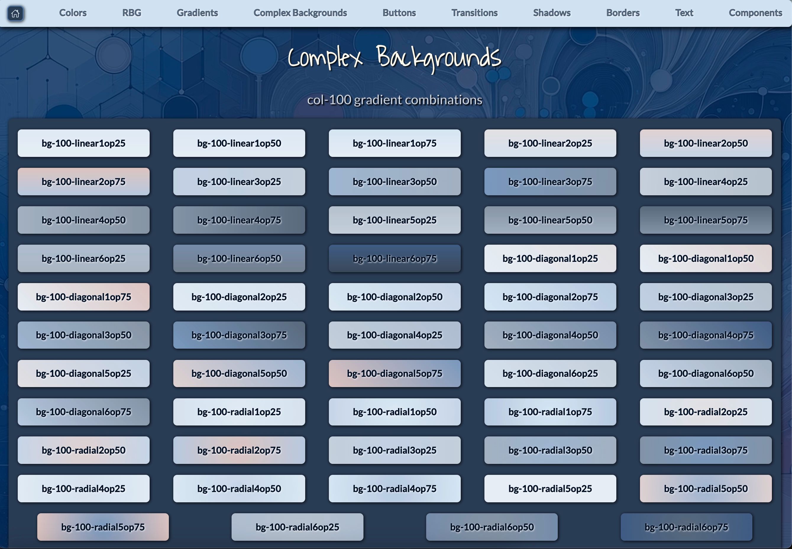 Figure 4: π Backgrounds - This image highlights the col-100 gradient combinations available for complex background designs in the Remix-Vite-Tailwind template.