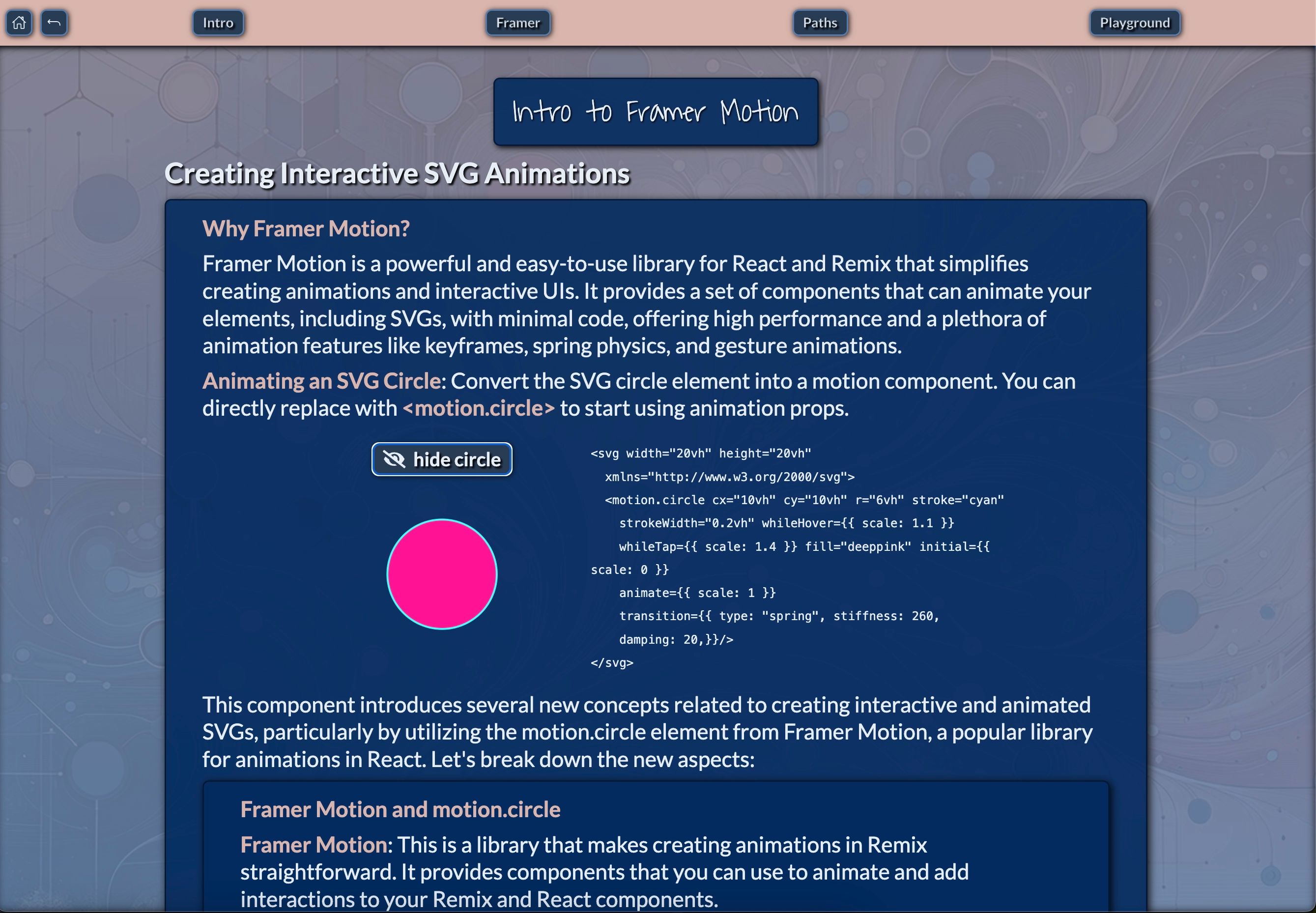 Figure 25: π Creating Interactive SVG Animations with Framer Motion - This image provides an overview of Framer Motion, a library for creating animated and interactive UI components in React and Remix.