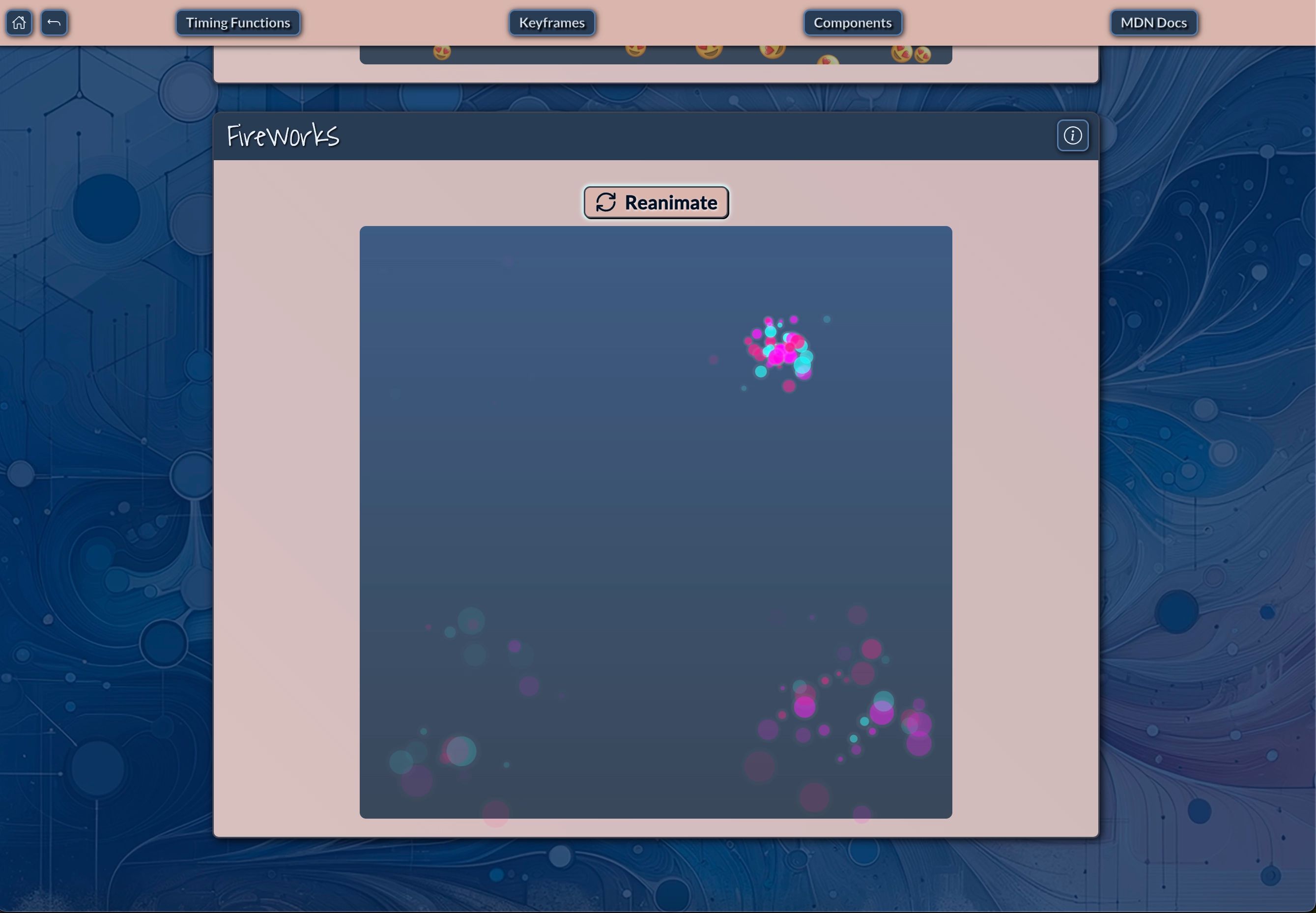 Figure 23: π Fireworks Animation - This image demonstrates a Fireworks animation using timing functions and keyframes, simulating fireworks bursts on a web page.