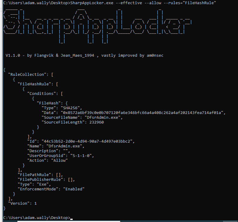 SharpAppLocker.exe --effective --allow --rules="FileHashRule,FilePathRule" --outfile="C:\Windows\Tasks\Rules.json"