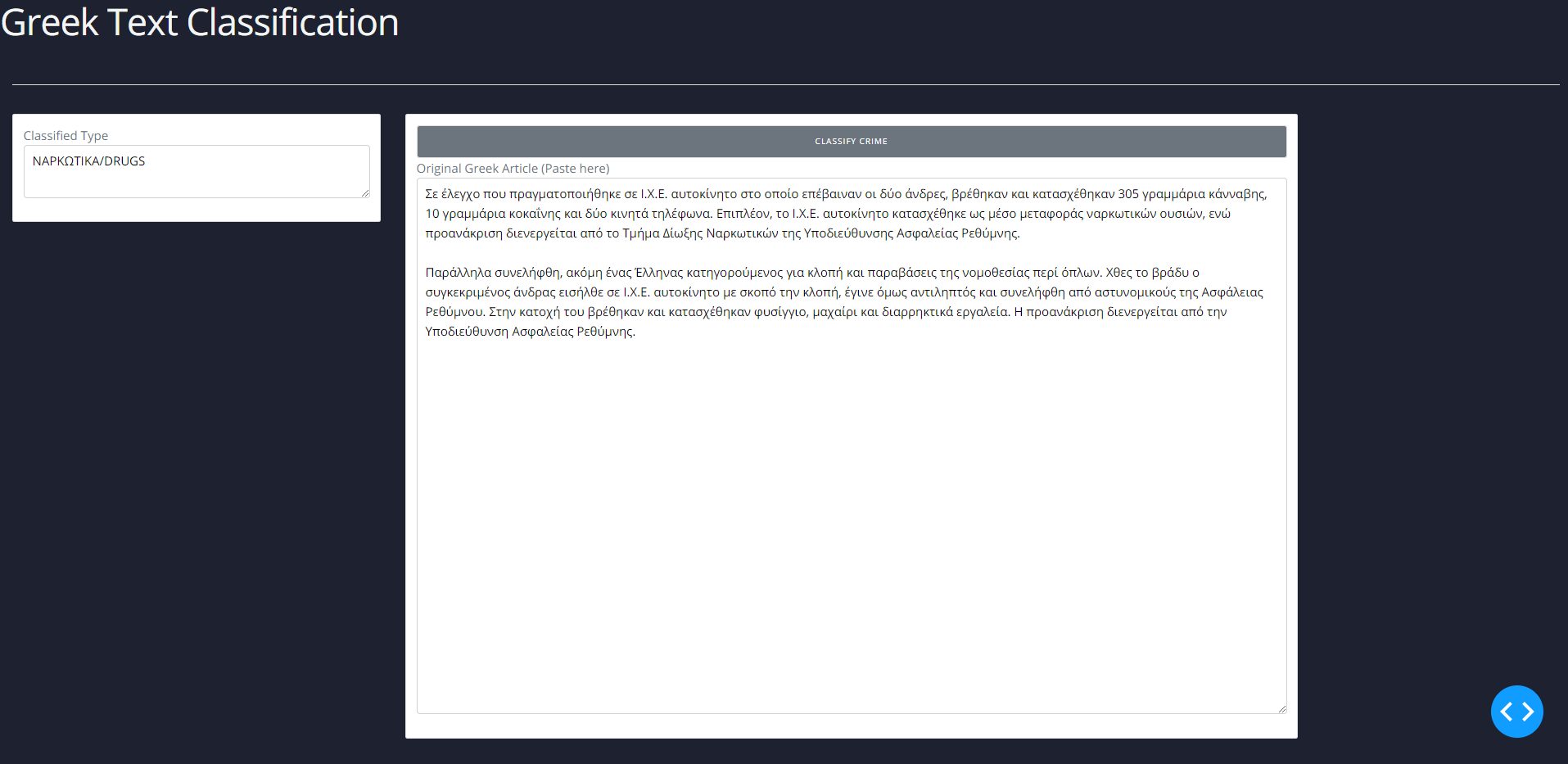 ArachneClassifier is a project for crawling, indexing, analyzing and classifying Greek articles. Currently it crawls pages from a Greek news site, specifically, crime articles and classifies them based on the crime type. Crawling and classification is customizable.