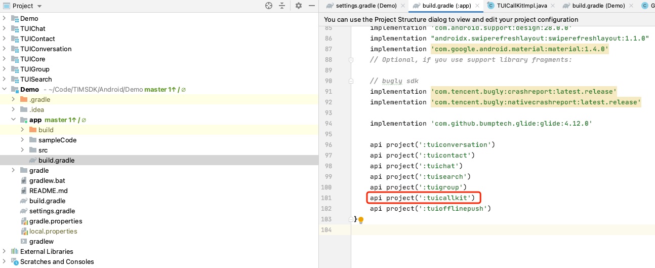 If you do not need the audio/video call feature, you only delete the audio/video call integration code as shown in the figure below from the build.gradle file under the app module: