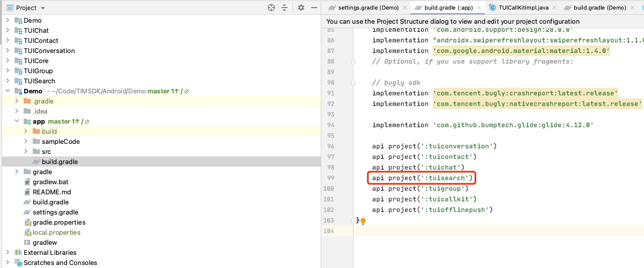 api project(':tuisearch')After the preceding steps are completed, the message search box in the demo is hidden.