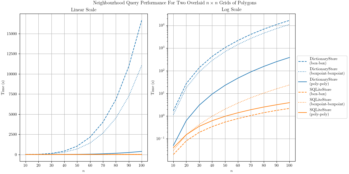 SQLiteStoresignificantly outperformsDictionaryStore.In this test an$n \times n$ grid of cell boundaries is generated and overlaid with another $n \times n$ grid. A query is then performed to find overlapping geometries via either any overlap of the bounding boxes (box-box) or the centre of the bounding boxes (boxpoint-boxpoint) within a distance $k$ . Therefore, the largest test here where $n=100$ is a grid of $100 \times 100$ artificial cell boundaries labelled as class "A", overlaid with another $100 \times 100$ grid of cell boundaries labelled with class "B" for a total of $20,000$ geometries.