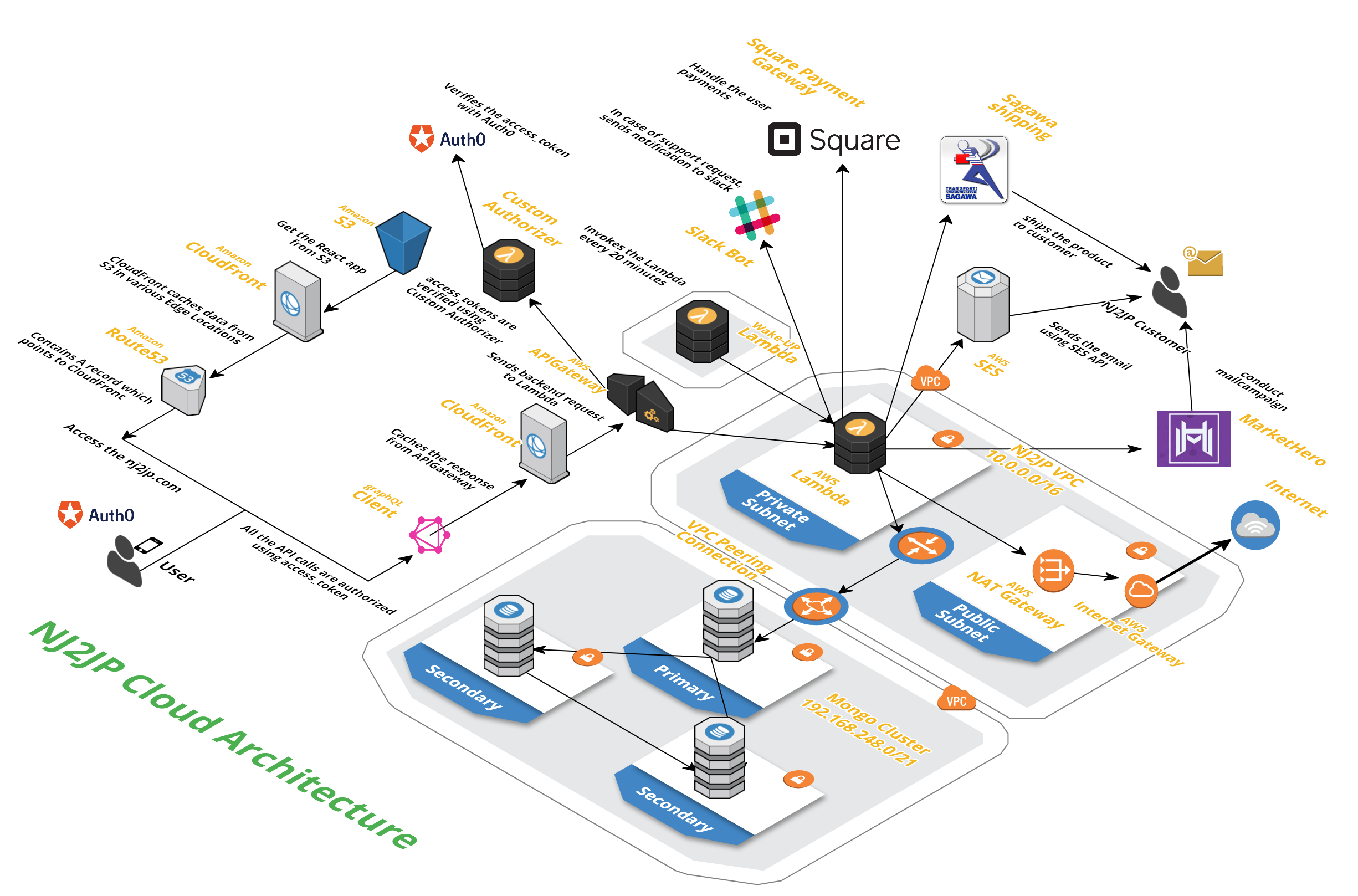 - Database utilizes a Mongo Cluster with 3 nodes. 2 Full + 1 Arbiter.