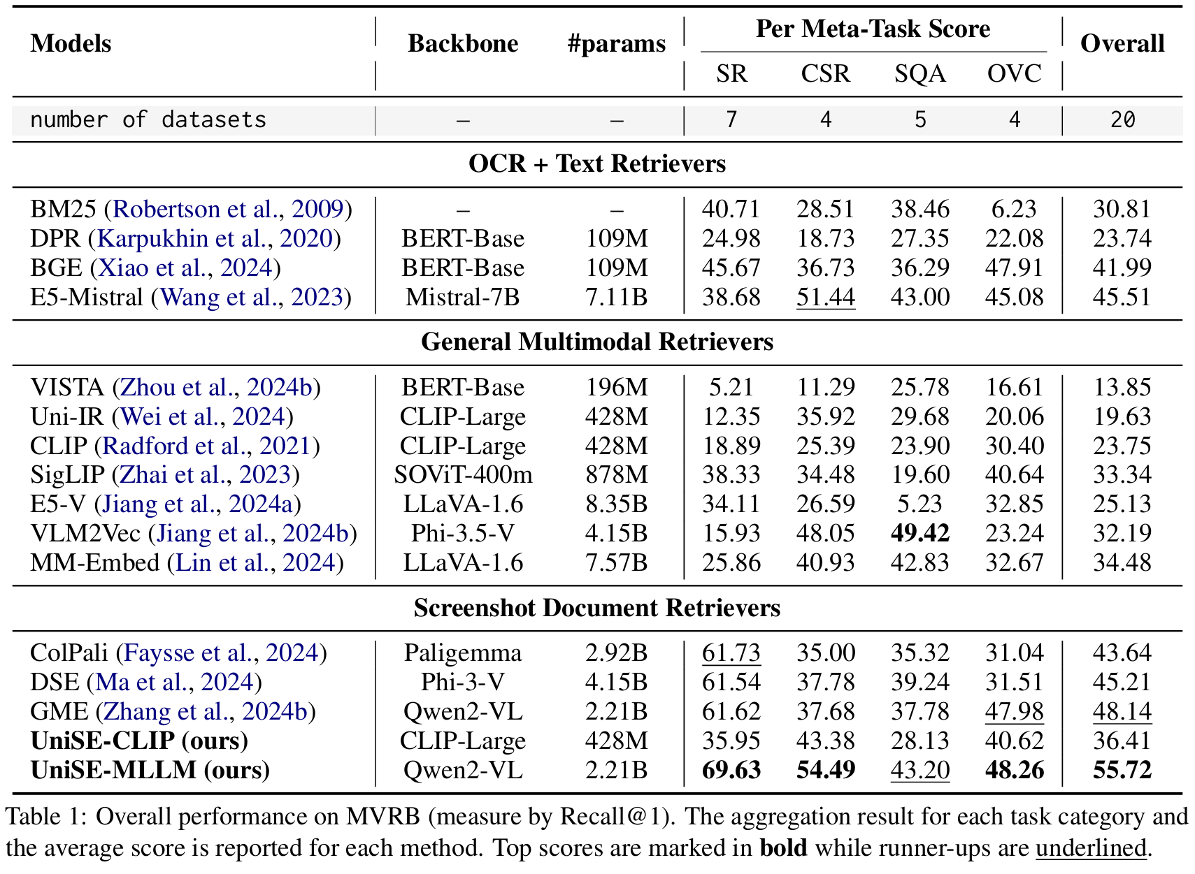 MVRB is a comprehensive benchmark designed for the retrieval task centered on screenshots. It includes four meta tasks: Screenshot Retrieval (SR), Composed Screenshot Retrieval (CSR), Screenshot QA (SQA), and Open-Vocabulary Classification (OVC). We evaluate three main types of retrievers on MVRB: OCR+Text Retrievers, General Multimodal Retrievers, and Screenshot Document Retrievers. Our proposed UniSE-MLLM achieves state-of-the-art (SOTA) performance on this benchmark.