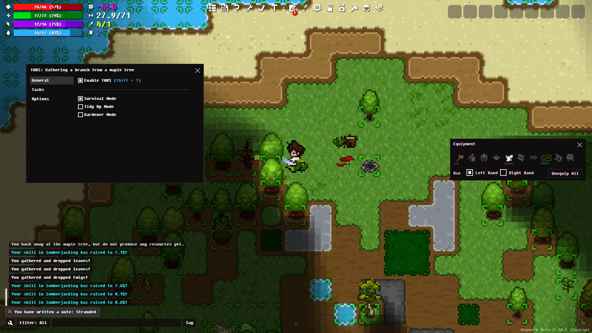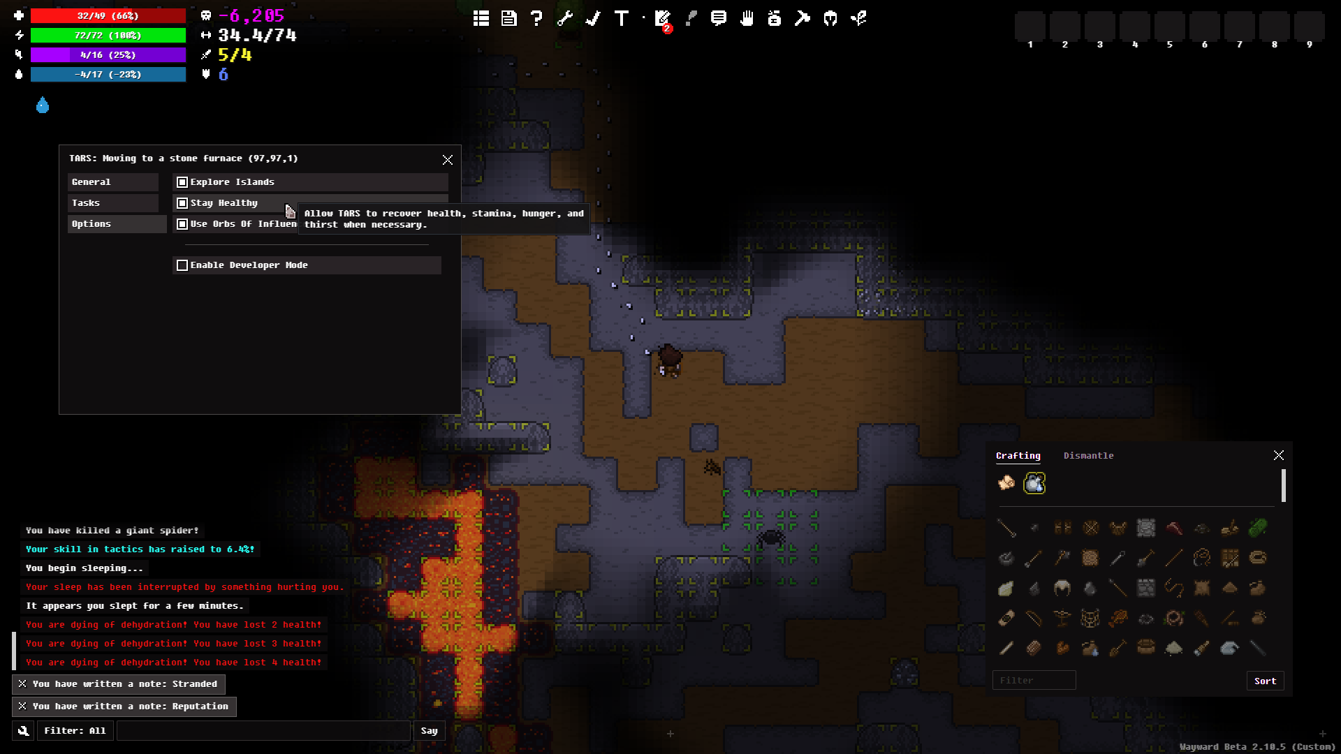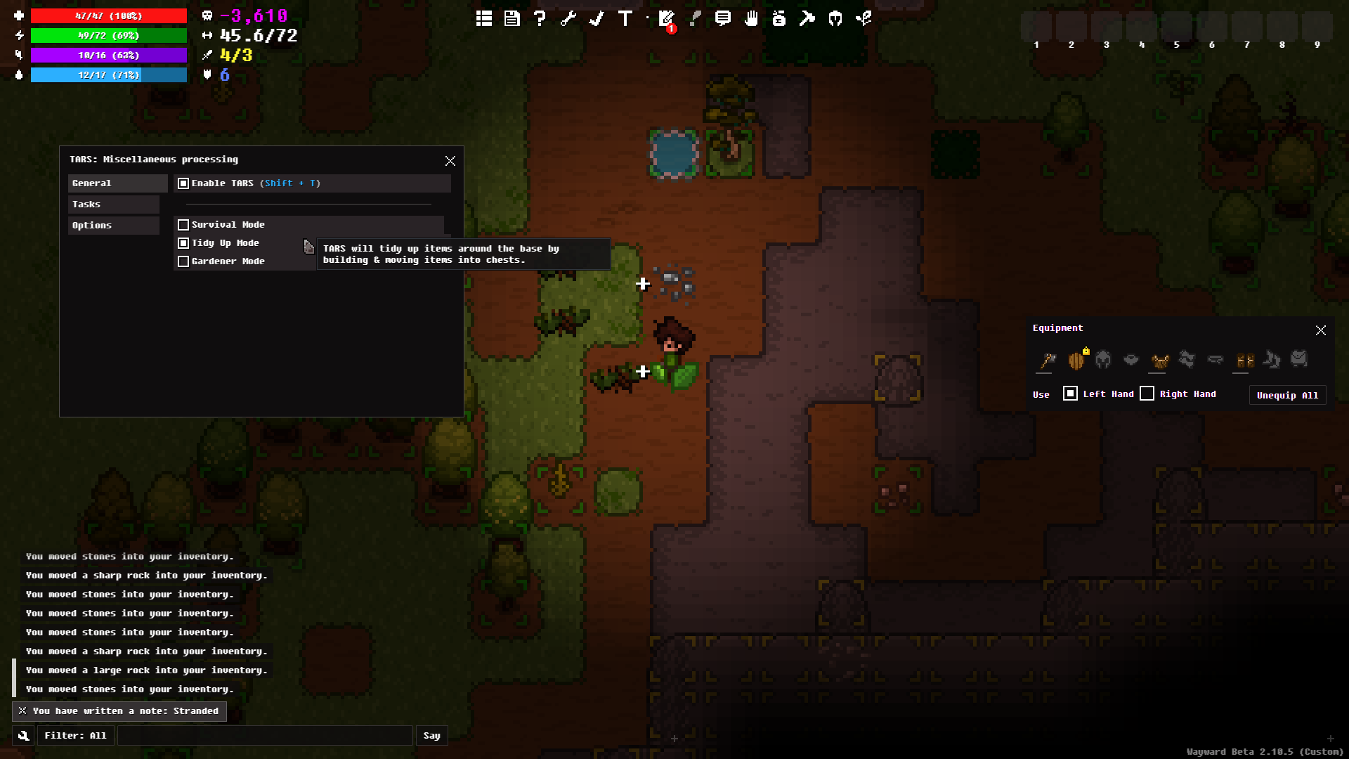TARS is a bot that will play Wayward by itself, doing tasks such as gathering resources, setting up a camp, hunting, getting food/water, and more! It's named after the robot from Interstellar.