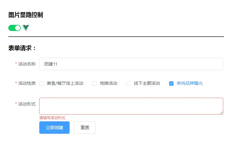 checkbox 开关控制图片的显隐 表单请求有验证,点击立即创建触发表单验证,验证通过提交表单;点击重置按钮去掉验证提示。