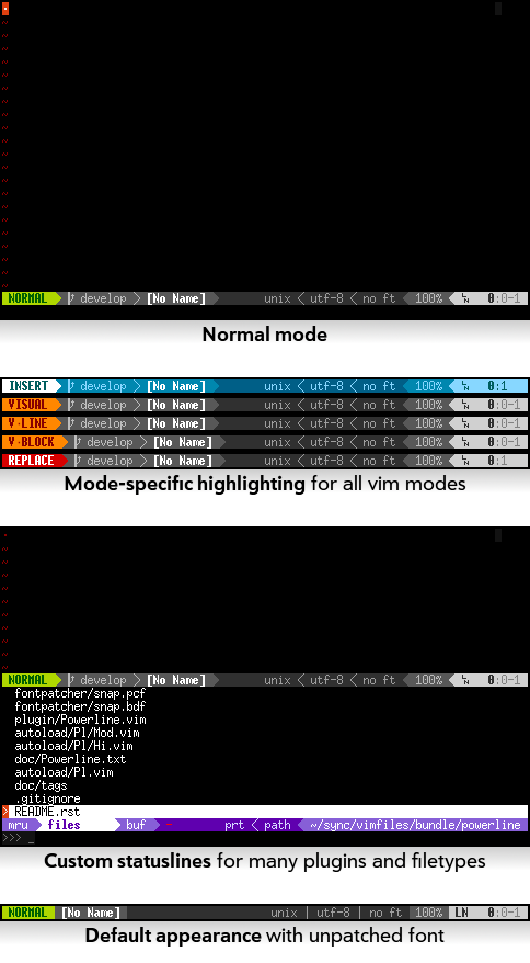 Powerline is a utility plugin which allows you to create better-looking, more functional vim statuslines. See the screenshots below for a demonstration of the plugin's capabilities.