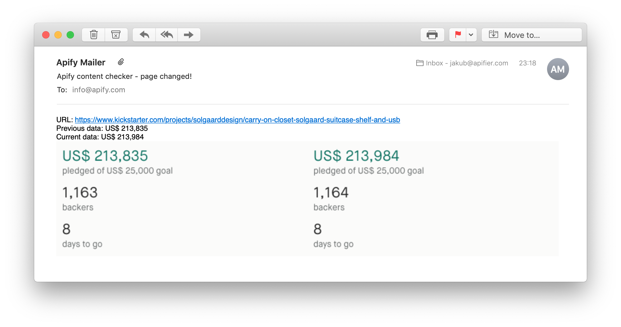 This actor lets you monitor specific content on any web page and sends an email notification with before and after screenshots whenever that content changes. You can use this to create your own watchdog for prices, product updates, sales, competitors, or to track changes in any content that you want to keep an eye on.