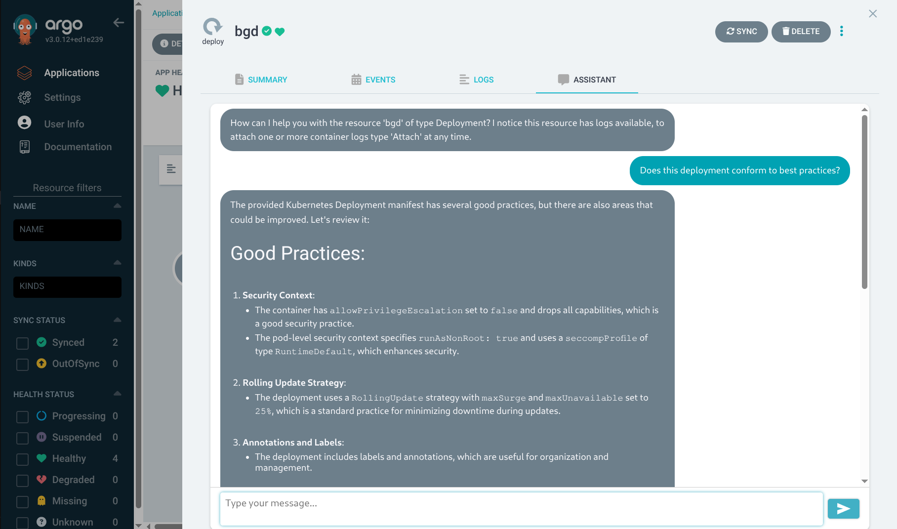 This is an Argo CD Extension which adds an AI Assistant Chatbot to the Argo CD UI. It currently uses llama-stack as the backend since this enables the potential use of tools such as MCP servers however at the moment it has only been tested with an inference engine using the Agent API.