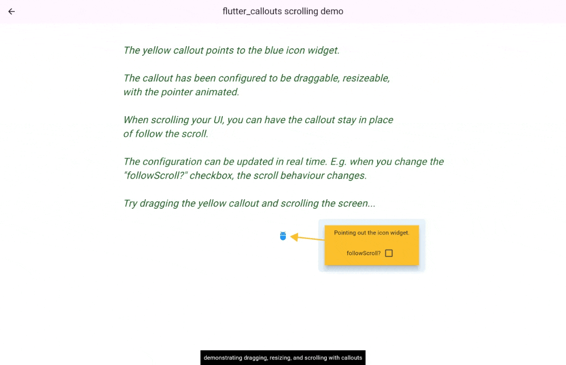 Being able have your callout point to a target widget is a very potent tool for helping your the users understand and navigate your app. A callout overlay’s pointing line can follow its target widget (by assigning the target a GlobalKey).
