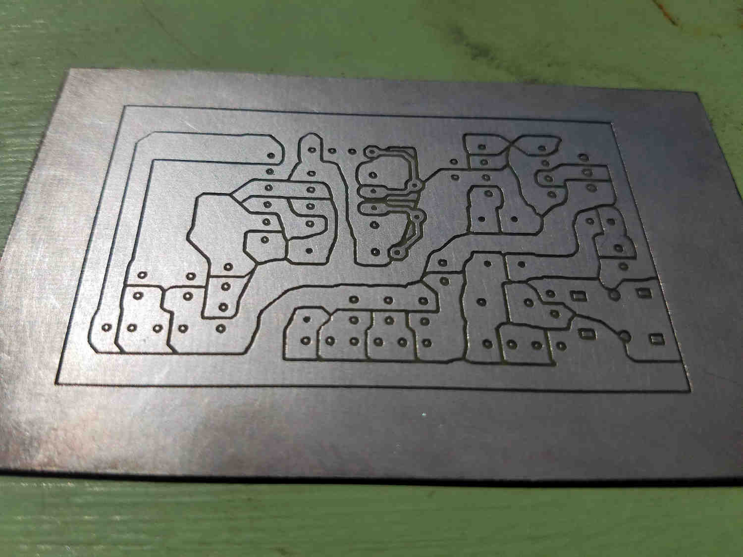 - Etch board as normal with Ferric Chloride or equivalent.
