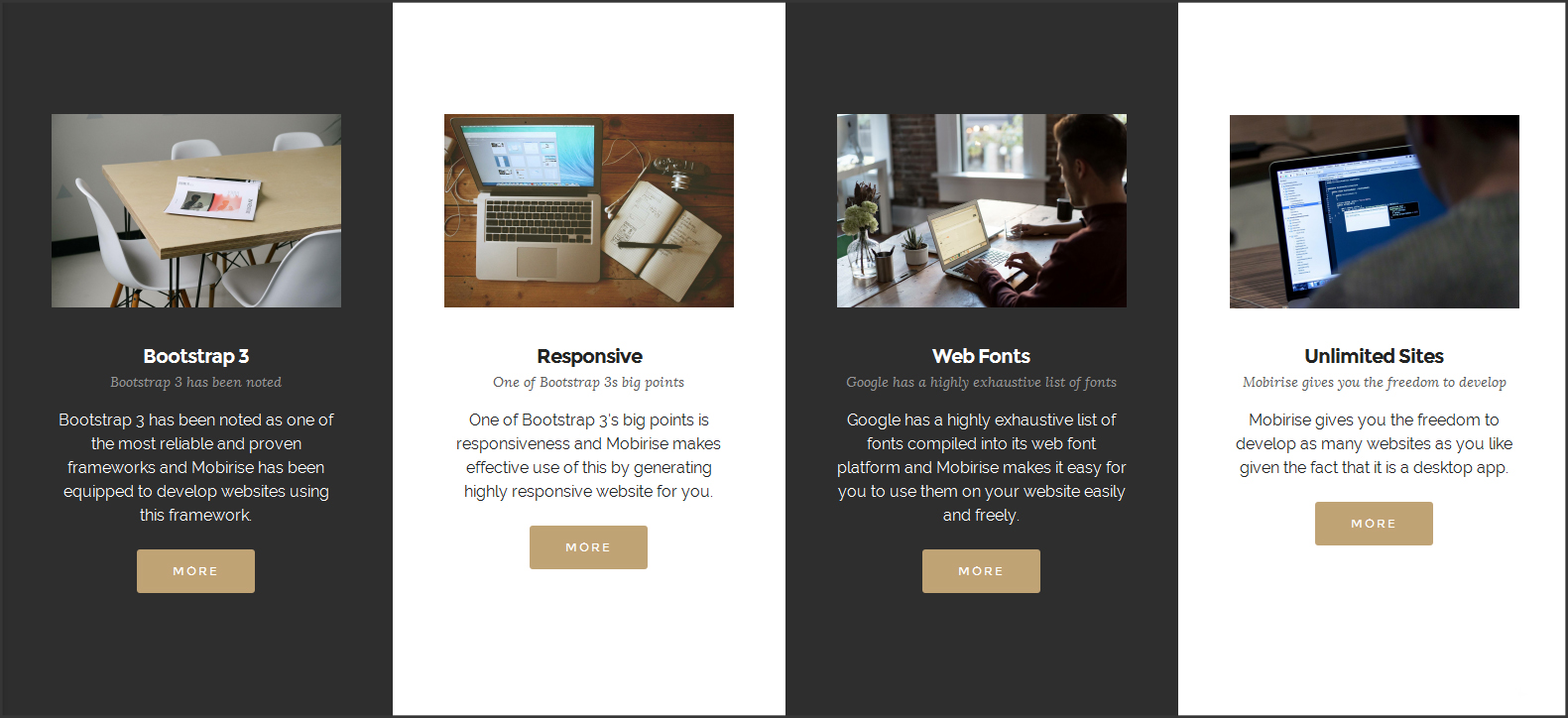 Bootstrap 3 has been noted as one of the most reliable and proven frameworks and Mobirise has been equipped to develop websites using this framework.