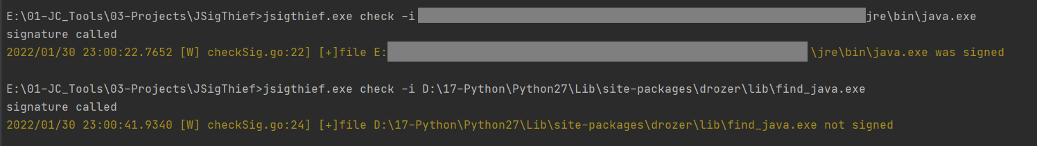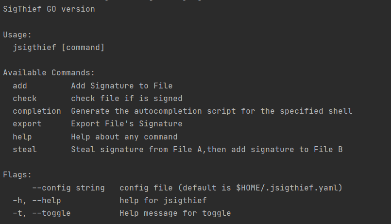 JSigThief 介绍 原版是python语言编写的,现在用golang写一版SigThief, 本工具属于JBypass免杀系列的其中一个工具。 本工具实现了python版sigthief中的大部分功能,目前只支持对exe程序进行签名提权和添加... 使用 检查某程序是否有签名 jsigthief.exe check -i <具体文件路径> 导出已签名程序的数字签名 jsigthief.exe export -i <已签名文件路径> -o <导出路径> 向目标文件添加导出的数字签名 jsigthief.exe add -s <导出的.sig文件> -t <待添加签名的程序> -o <签名后输出路径> 直接偷取某程序的签名并添加到待签名的程序中 jsigthief.exe -i <带有数字签名的PE文件> -t <待签名的PE文件> -o <签名后的输出路径>