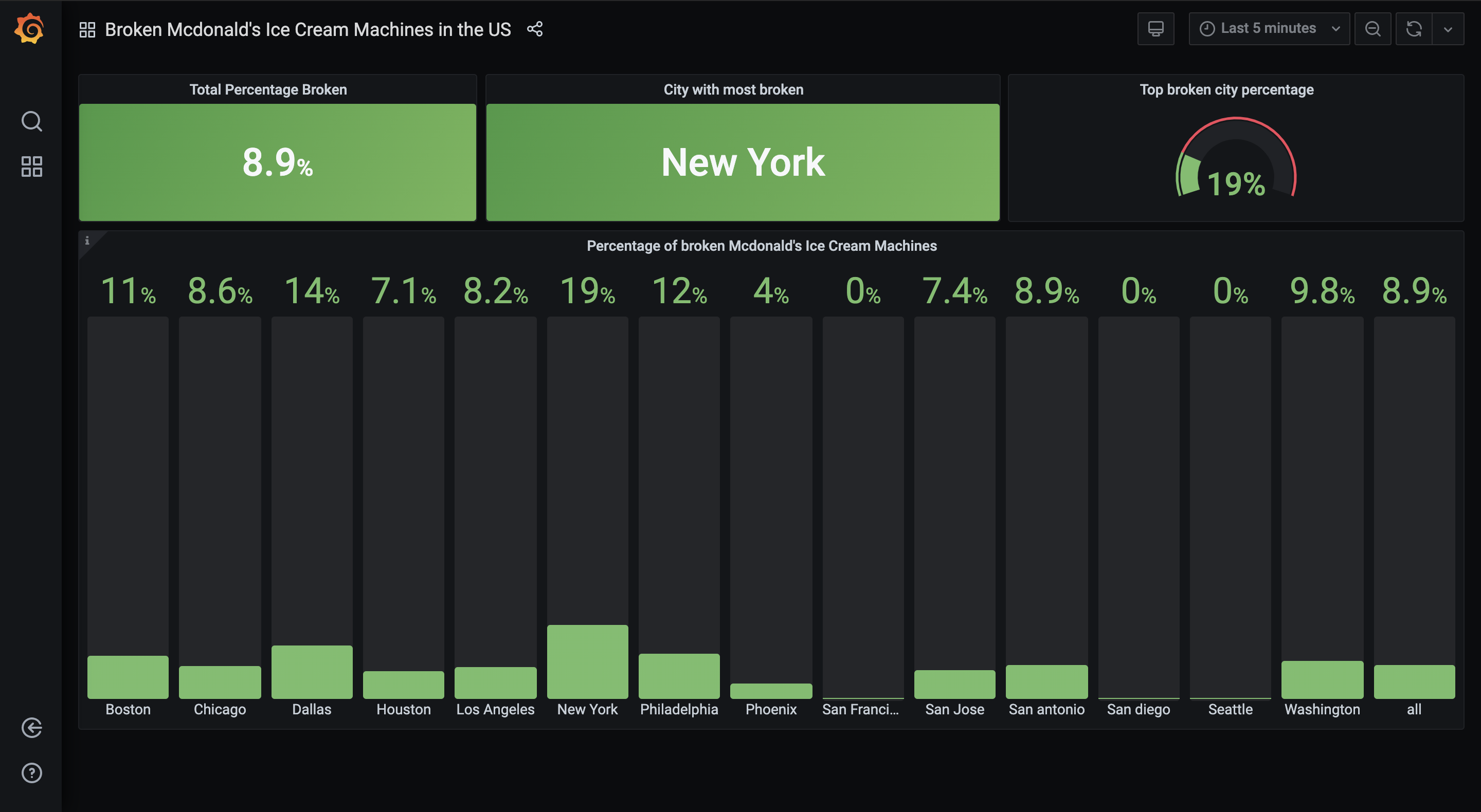 The mcbroken dashboard is an app template of 3 applications(listed below) which pre-configure a dashboard that is powered by mcbroken.com. It's purpose is to provide availability information of all the broken Mcdonald's ice cream machines in the United States.