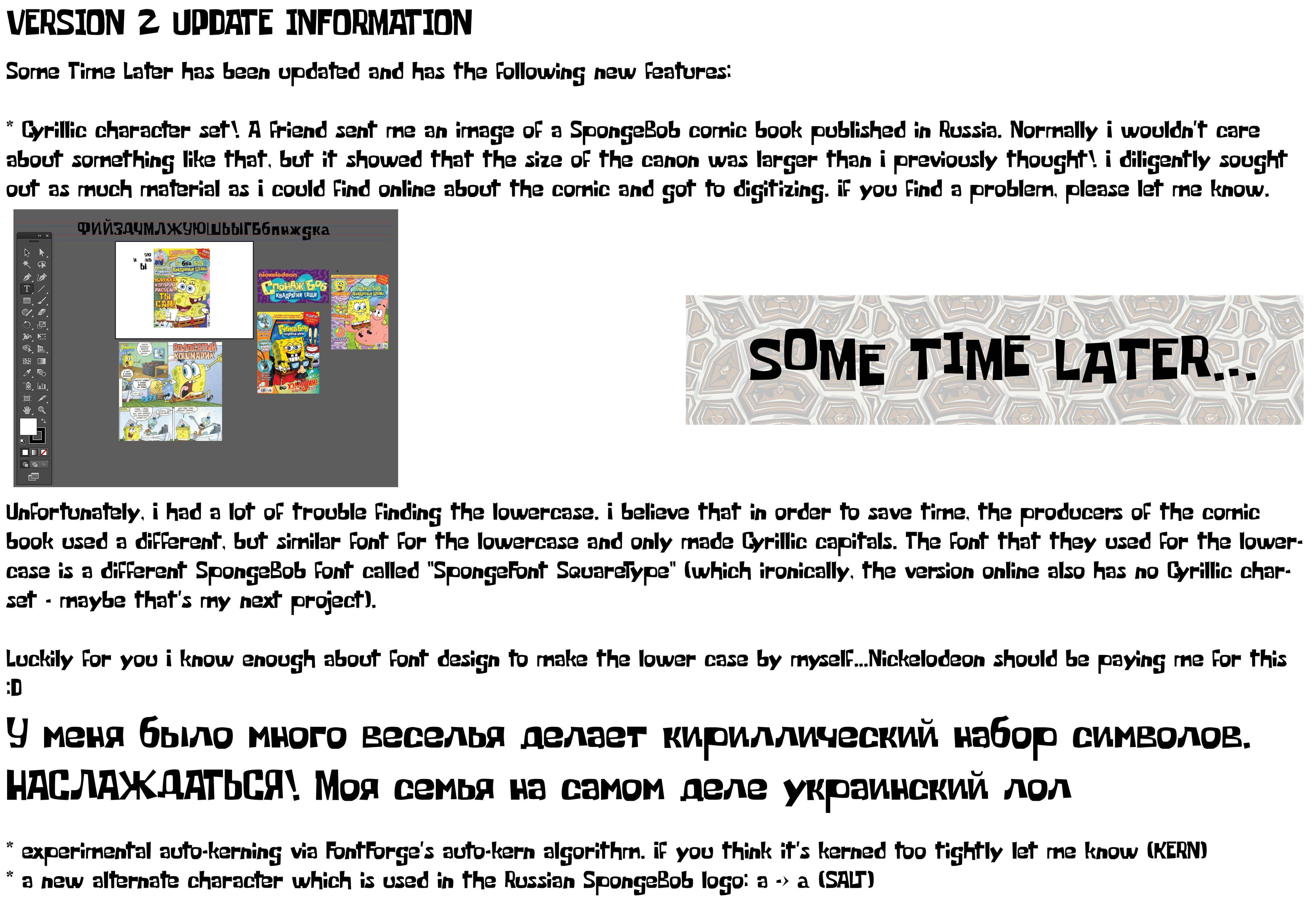 - Cyrillic character set! A friend sent me an image of a SpongeBob comic book published in Russia. Normally I wouldn't care about something like that, but it showed that the size of the canon was larger than I previously thought! I diligently sought out as much material as I could find online about the comic and got to digitizing. If you find a problem, please let me know.