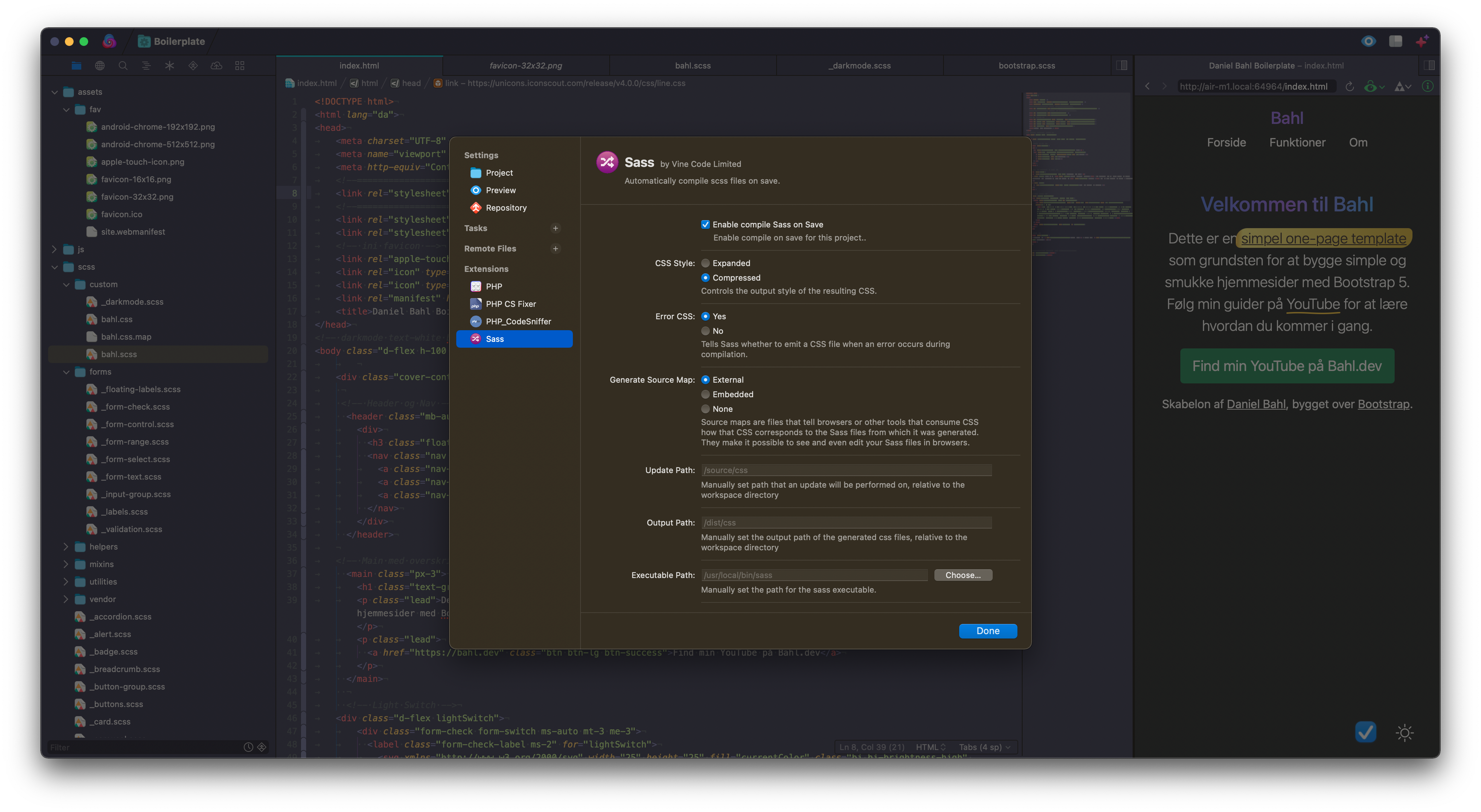Herefter kan du under Project -> Project Settings aktiverer Sass-plugin, så alt .scss kode automatisk compiles til .css :)