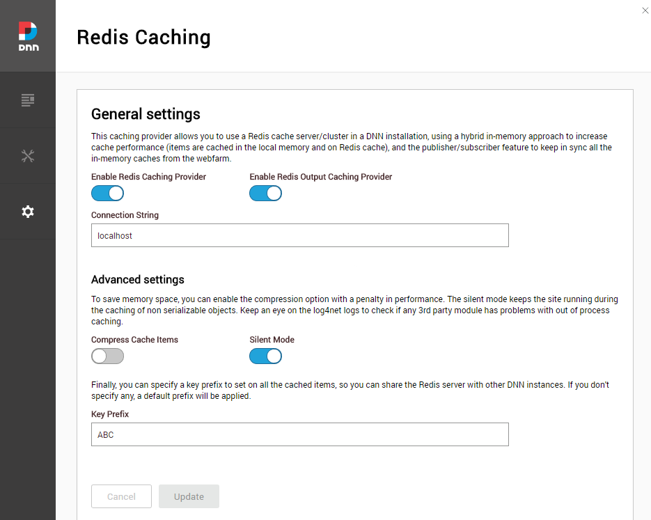 There are some attributes you can use to tweak or debug the caching provider. The initial set of configurable attributes are:- keyPrefix (default string.Empty): this attribute is used to add a prefix to each key stored on the Redis cache. This can be used to share the Redis cache between different DNN deployments. When no prefix is specified (default empty string), the current DNN Host Guid will be used so by default, the cached keys are partitioned by the Host identifier.
