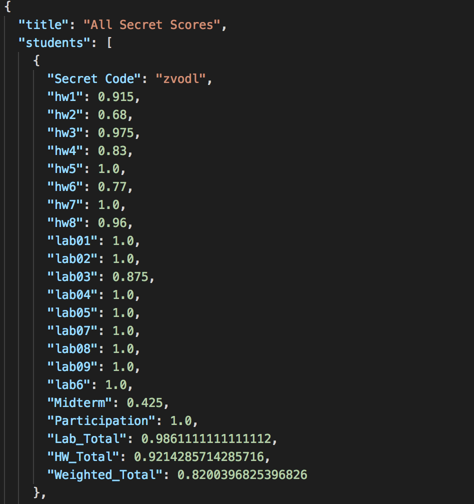 The program csv_to_json.py was used to take a spreadsheet of student grades and turn them into a more readable json file, scores.py. This allowed for the students to search through the json file for their secret ID and find specific grades more easily than having to follow columns down in the csv.