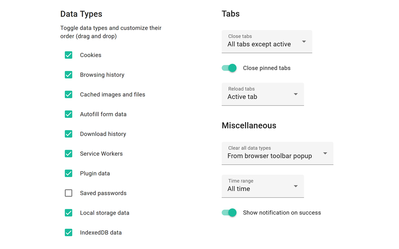 Clear Browsing Data is a browser extension which enables you to delete browsing data, such as cookies, history and cache, directly from the browser toolbar. The toolbar button can be configured to clear all browsing data with a single click, and the extension also supports closing and reloading tabs.