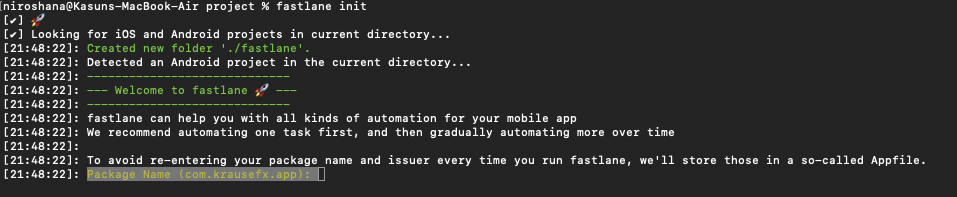 Please enter your app unique package name. This package name will be stored with fastlane for future tasks. Then you will be prompted to enter the path for service account JSON file. You are going to manage it later in this tutorial, So press Enter to skip for now.