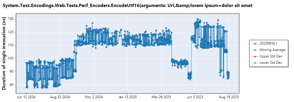 System.Text.Encodings.Web.Tests.Perf_Encoders.EncodeUtf16(arguments: Url,&lorem ipsum=dolor sit amet,16)