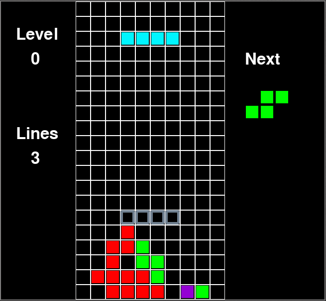 Tetris with pygame,the module of python Pre-installation python3 and pygame Start python3 Tetris.py How to play Instruction Right,Left and Down arrow key to move z,x or Up arrow key to rotate space to immediately down to the bottom Select difficulty Difficulty from 0 to 5 Game preview