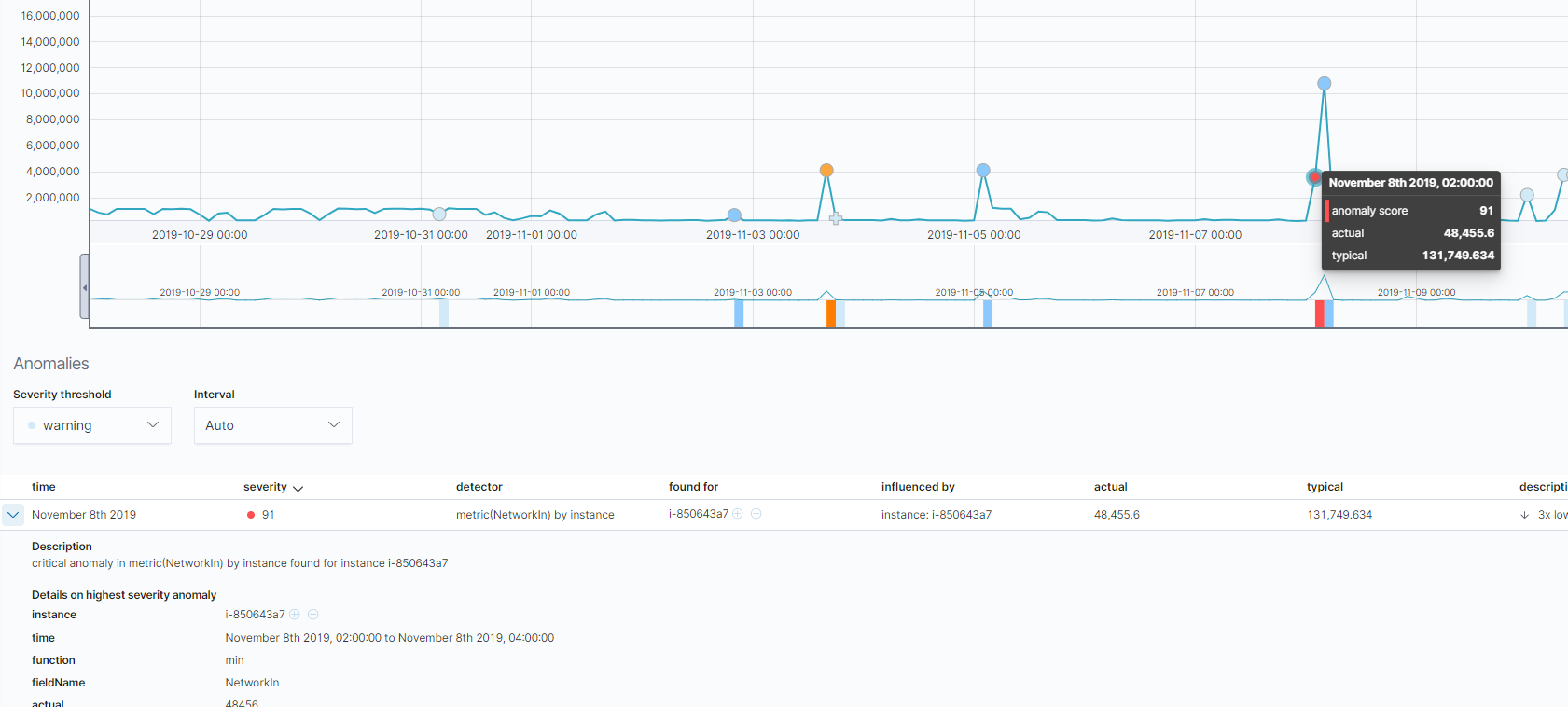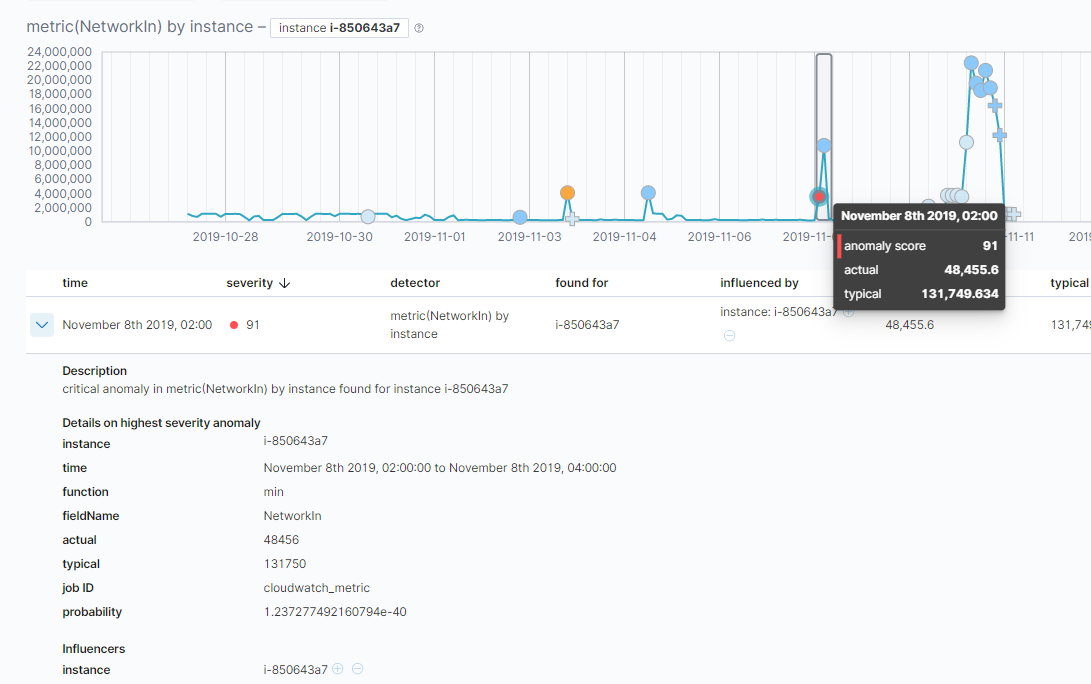 Currently the chart always plots mean, which can give misleading results. For example, here the highest scoring (red) anomaly is in the min function, but the Anomaly Explorer chart plots mean, with the actual value of the anomaly not corresponding to the y-value shown in the chart: