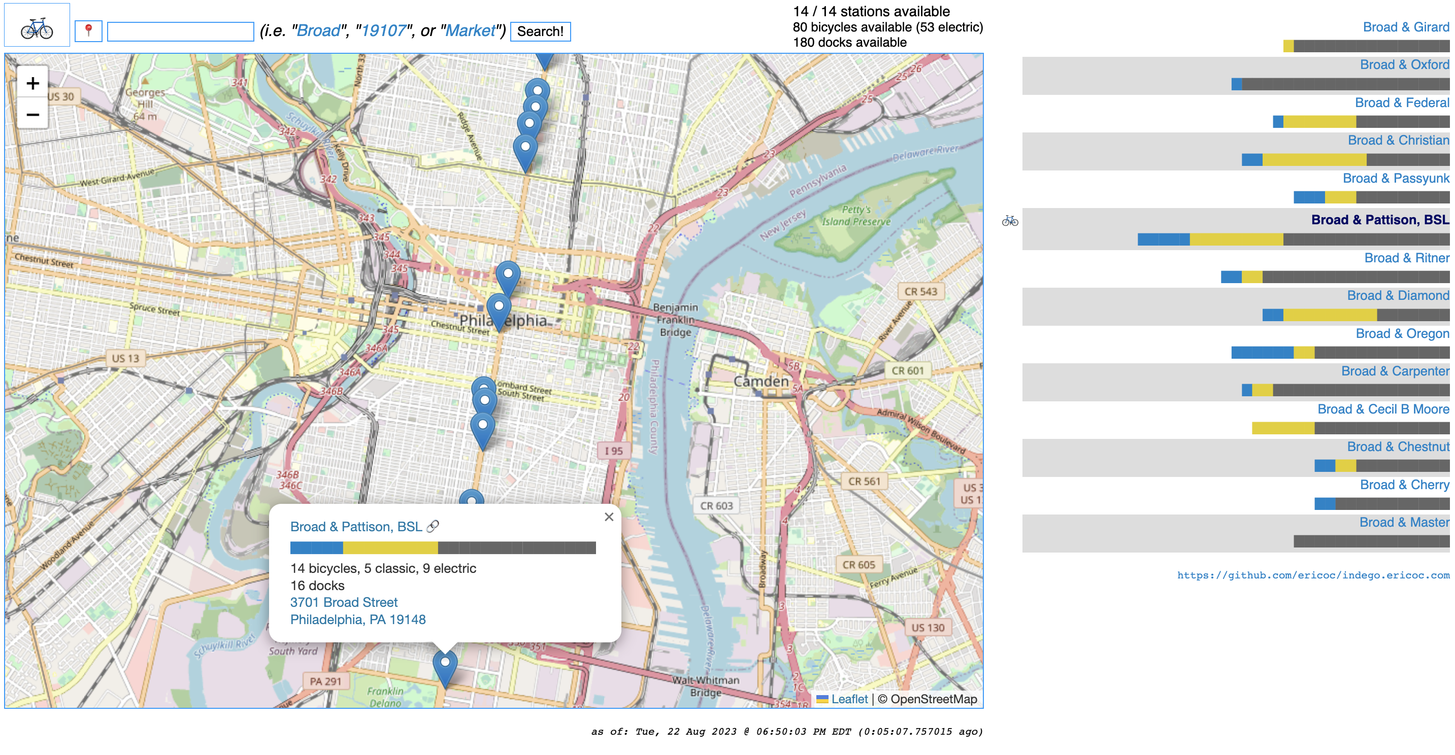 I discovered that a GeoJSON API exists, which provides information about the bicycle and docks available at each of the stations on the OpenDataPhilly website: