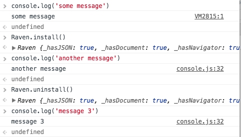 Once Raven.install() is executed, all console.log() calls will be replaced by Raven's own implementation. This behaviour will persist even when Raven.uninstall() is called.