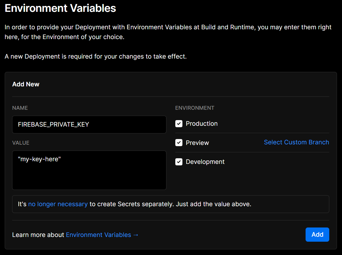Setting FIREBASE_PRIVATE_KEY env on vercel through web ui
