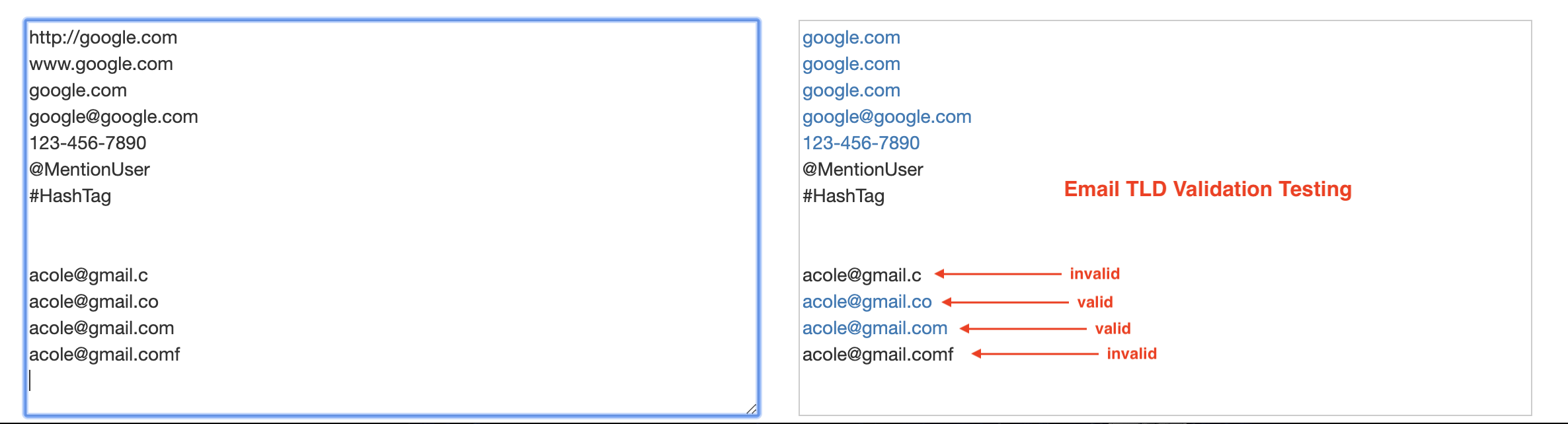 Just a suggestion: we can prevent matching on email addresses with invalid TLDs like [email protected]. More examples in tests.