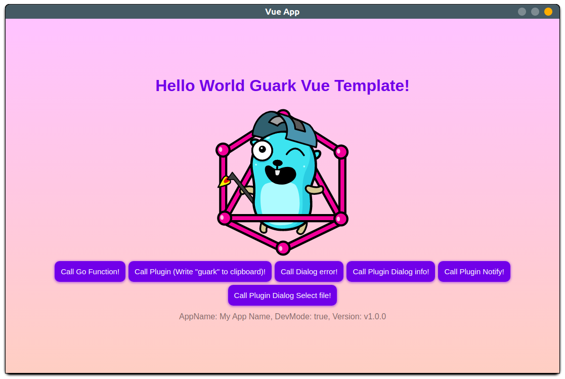 Guark Vue Template Guark Vue.js app template. Install Create new empty directory and cd to it, and run: guark init --template vue --mod github.com/username/appname Run dev app. Run dev app with vue hot reload: guark run Build guark build Bundle guark bundle