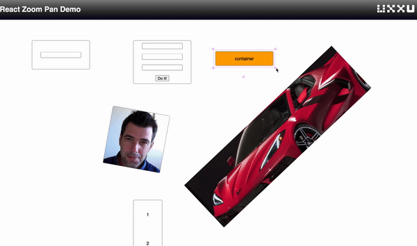 Using this component is really easy, Import the ZoomPan component,add the ZoomPan to your render method and add whatever other component inside the ZoomPan container. And that's all. Now all the components inside the container can be move,resize and rotate, you also can use your mouse wheel to zoom and pan.