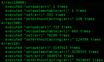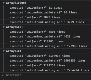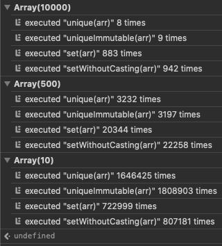 for (let fn of [unique, uniqueImmutable, set, setWithoutCasting]) {