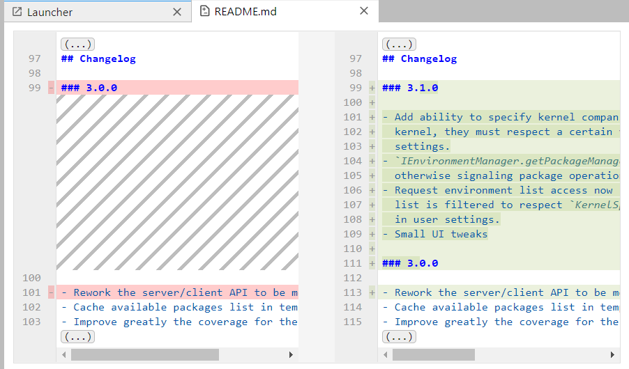 diff-match-patchnpm package and the default view for the two panels case is to set the old text on the left panel and the current one in the right panel.